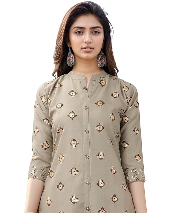 Colour Beige Neck Style V-Neck Sleeve Type 3/4 Sleeve Style Name Regular Lifestyle Business Casual, Casual, Comfort, Evening, Formal Fit Type Regular Collar Style Mandarin Collar Design Name Printed